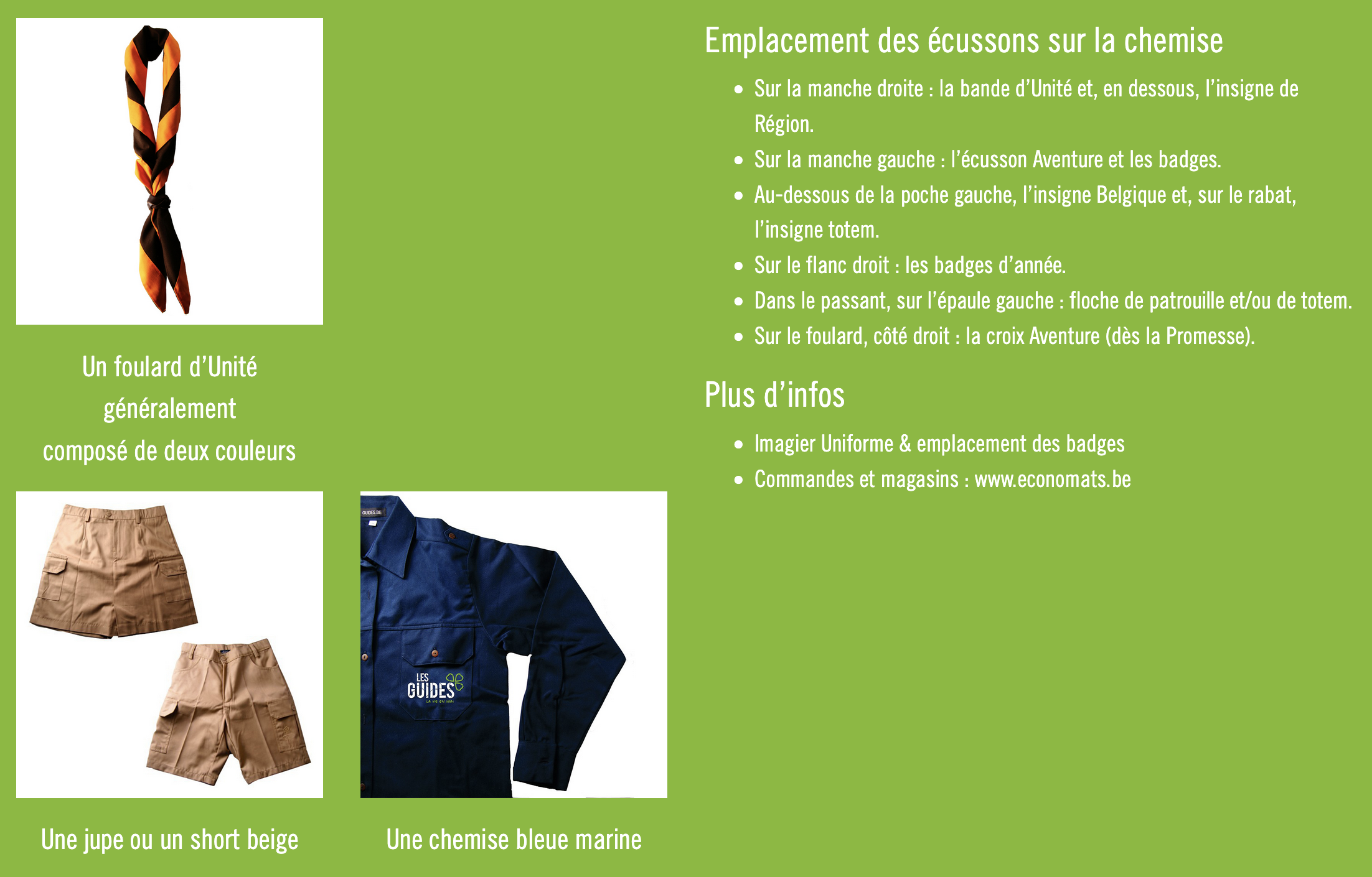Il se compose du foulard brun bordé d'orange, d'une chemise bleue foncée et d'un short beige.