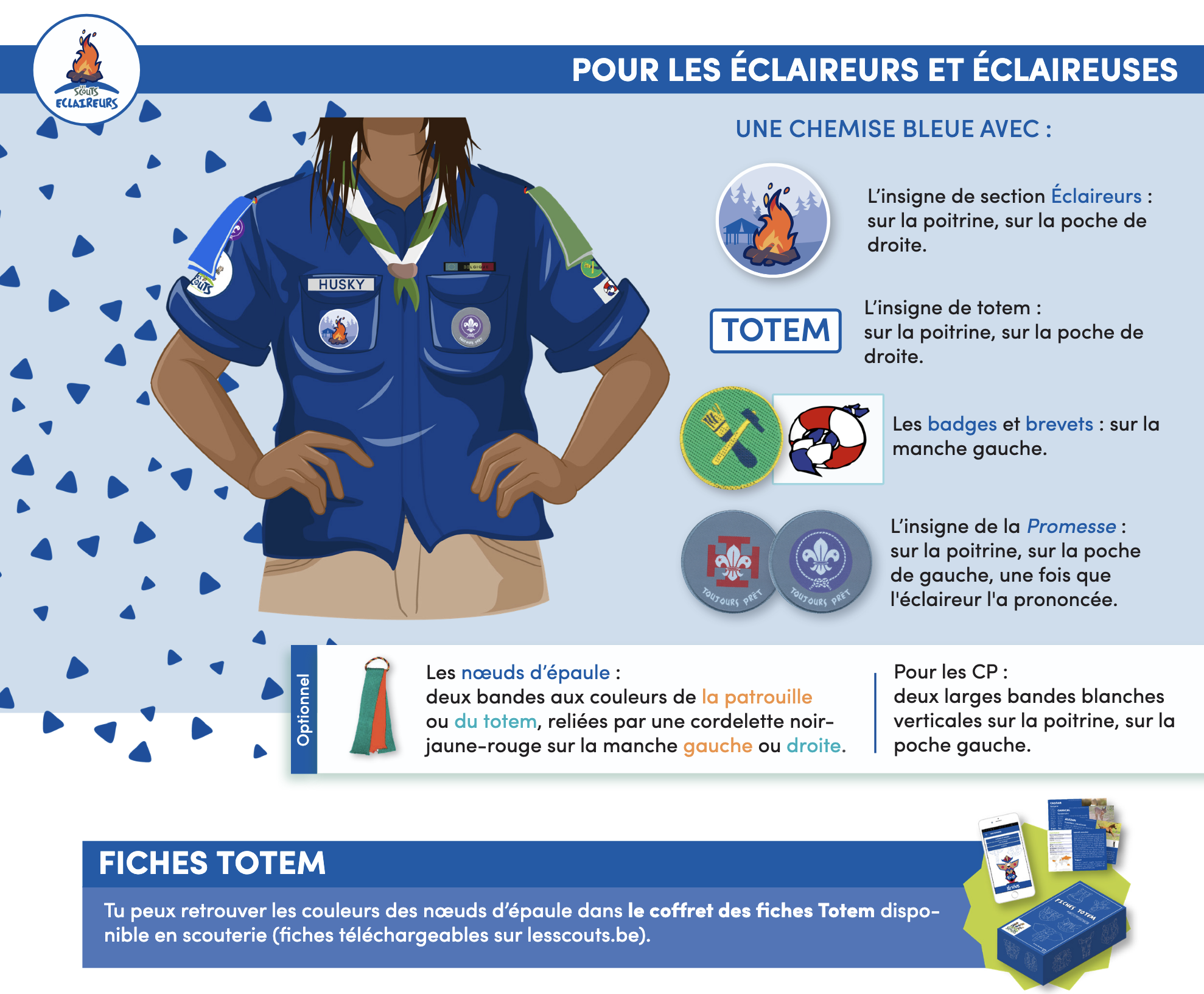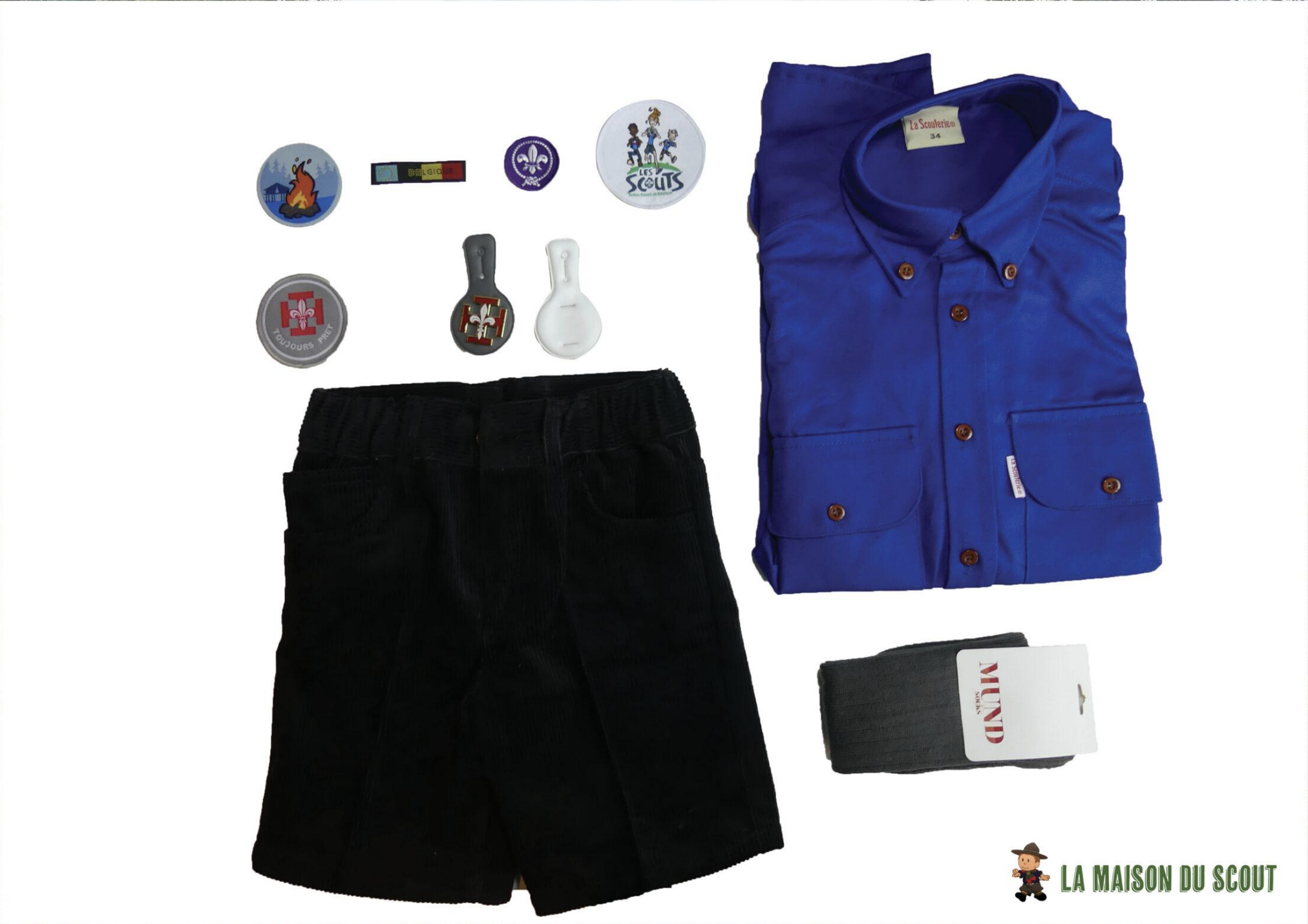 Il se compose du foulard vert bordé d'orange, d'une chemise bleue roi et d'un short bleu.